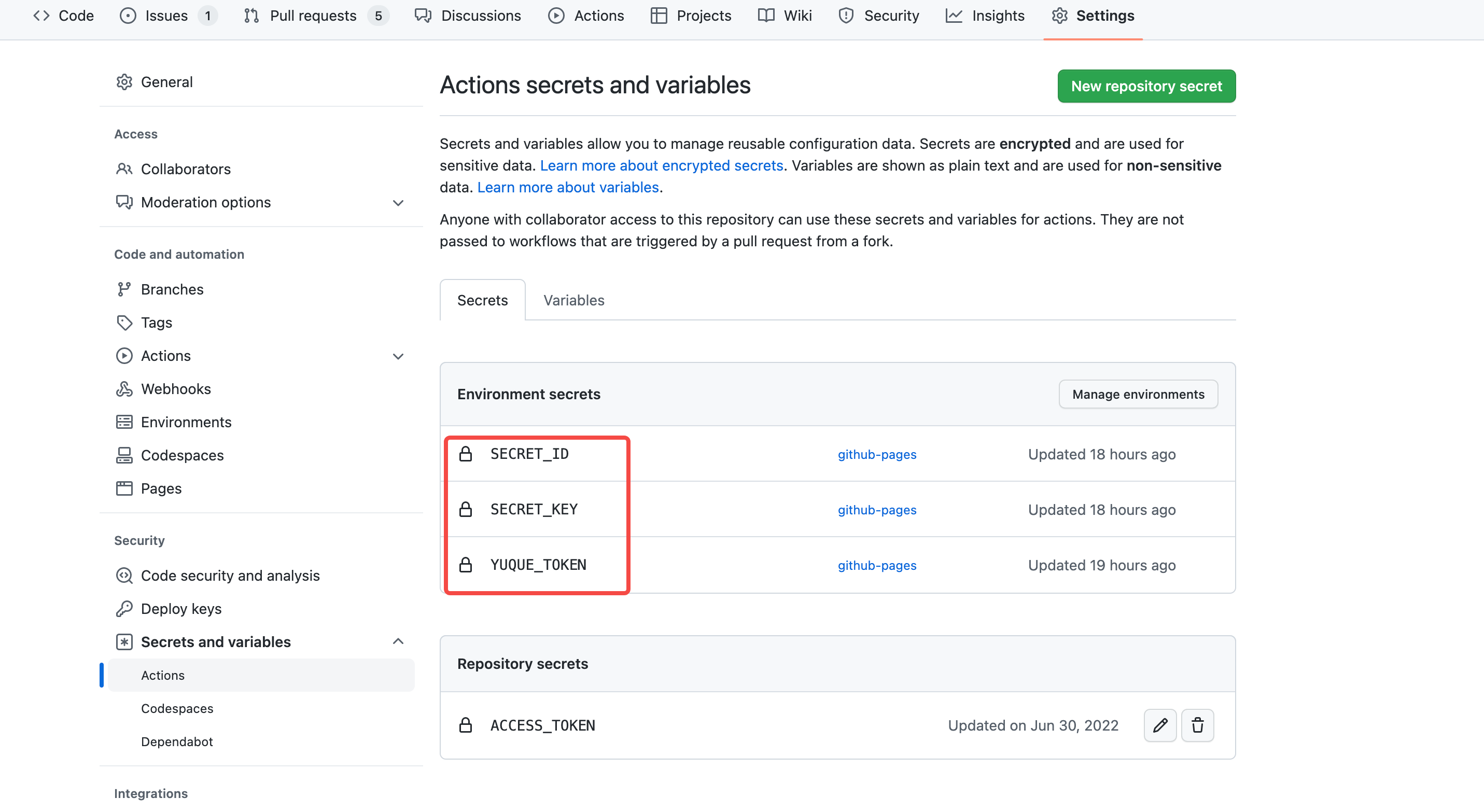 jobs: build-and-deploy: environment: github-pages env: yuque_token: ${{ secrets.YUQUE_TOKEN }} secret_id: ${{ secrets.SECRET_ID }} secret_key: ${{ secrets.SECRET_KEY }} runs-on: ubuntu-latest