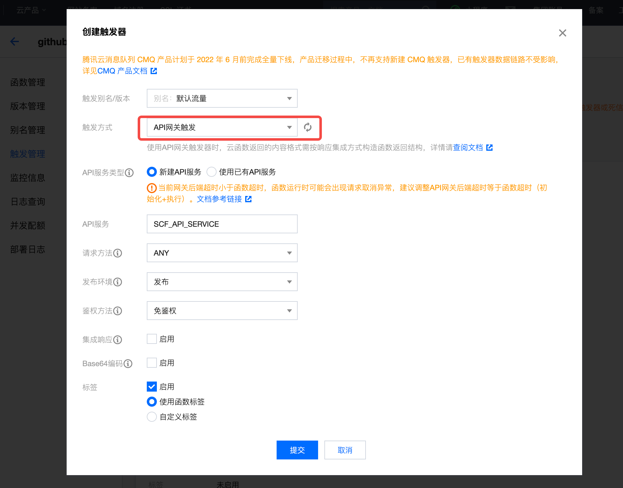 触发器设置,触发方式选择「API 网关触发」,其它默认: