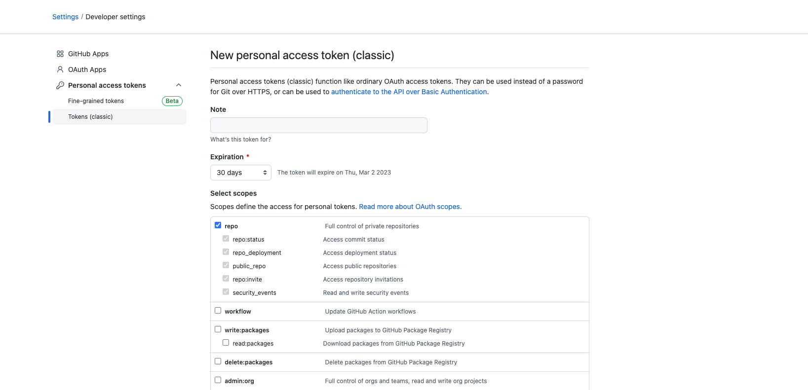 - 访问链接页面 https://github.com/settings/tokens/new 申请一个 Token,需要勾选 repo 权限。