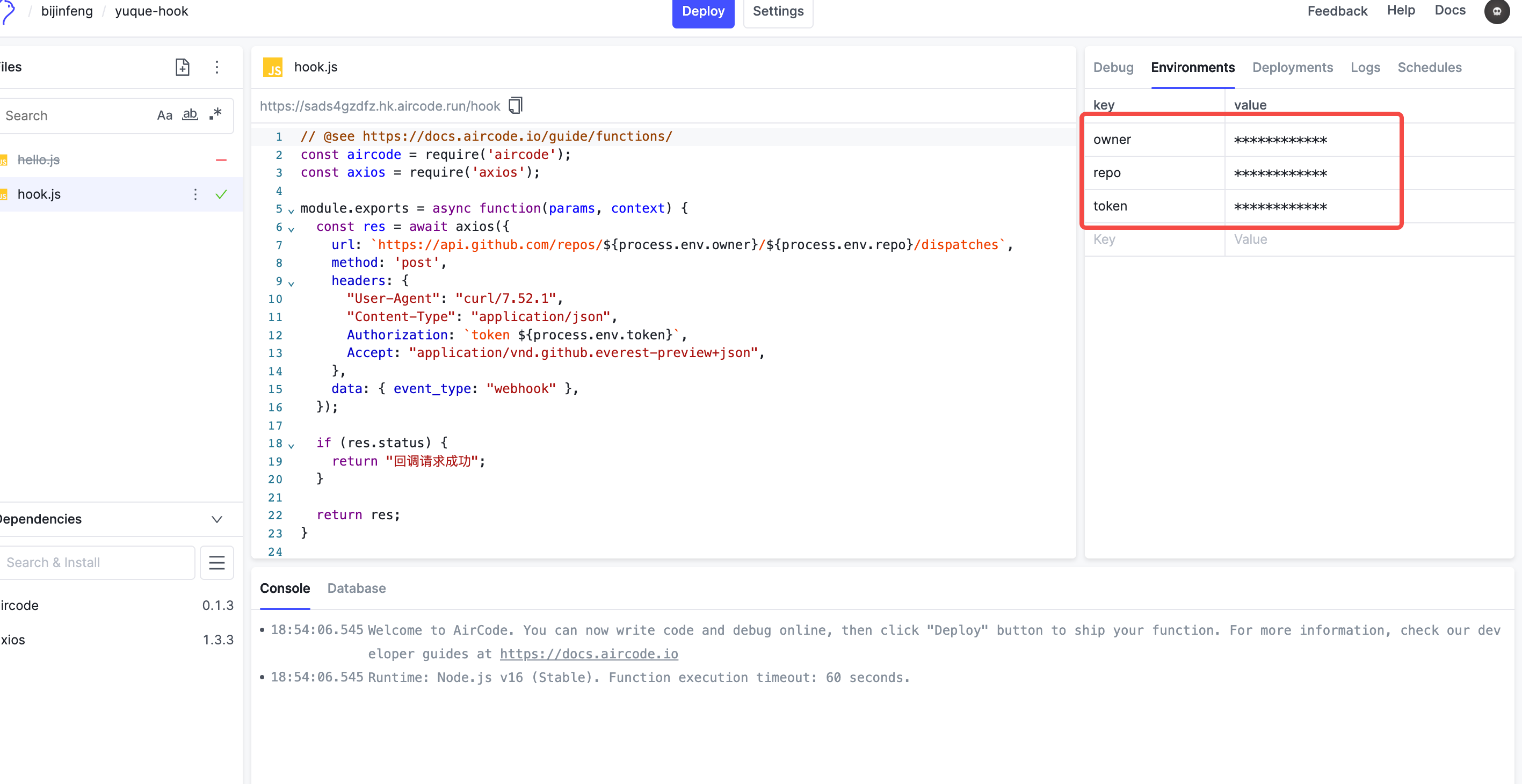 module.exports = async function (params, context) { const res = await axios({ url: `https://api.github.com/repos/${process.env.owner}/${process.env.repo}/dispatches`, method: "post", headers: { "User-Agent": "curl/7.52.1", "Content-Type": "application/json", Authorization: `token ${process.env.token}`, Accept: "application/vnd.github.everest-preview+json", }, data: { event_type: "webhook" }, });