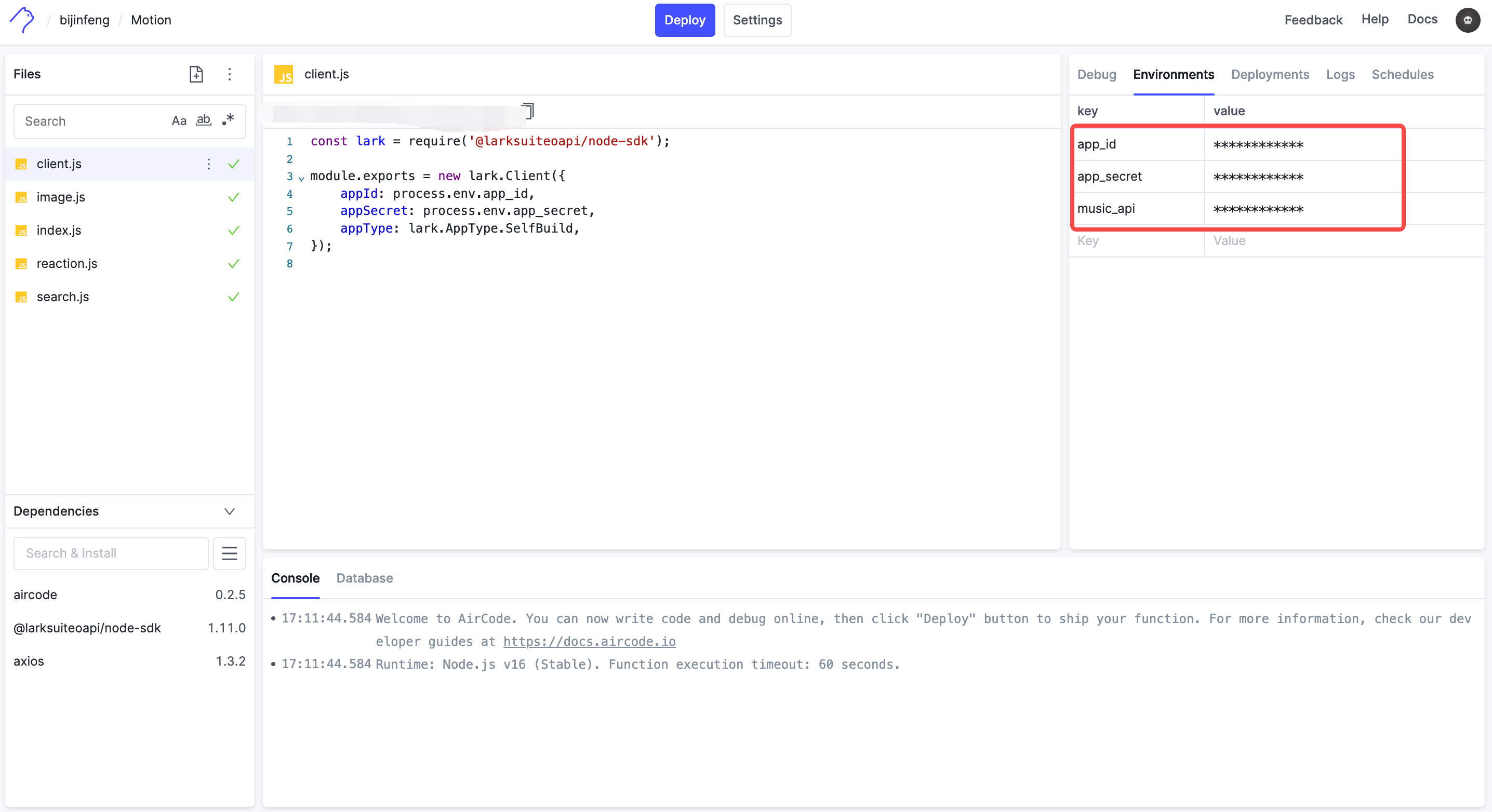 app_id 和 app_secret这两个环境变量从飞书开放平台获取后,配置到 AirCode 的 Enviroments Tab 下: