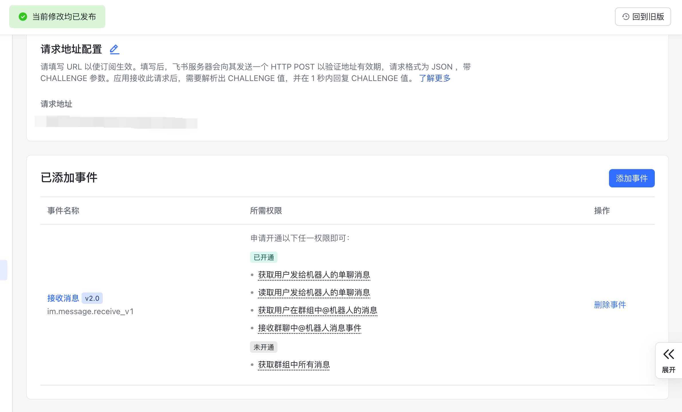 - 订阅事件:只需要「接收消息」的事件就行,请求地址配置成上面 👆 机器人请求地址