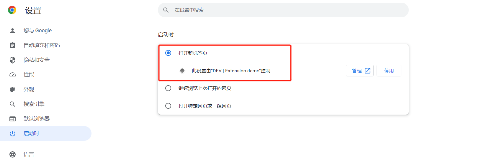 在点击主页按钮或者新建 tab 页时会打开该页面,同时浏览器的启动页配置会变成插件 这个 page 在开发导航类的插件时会非常有用 |