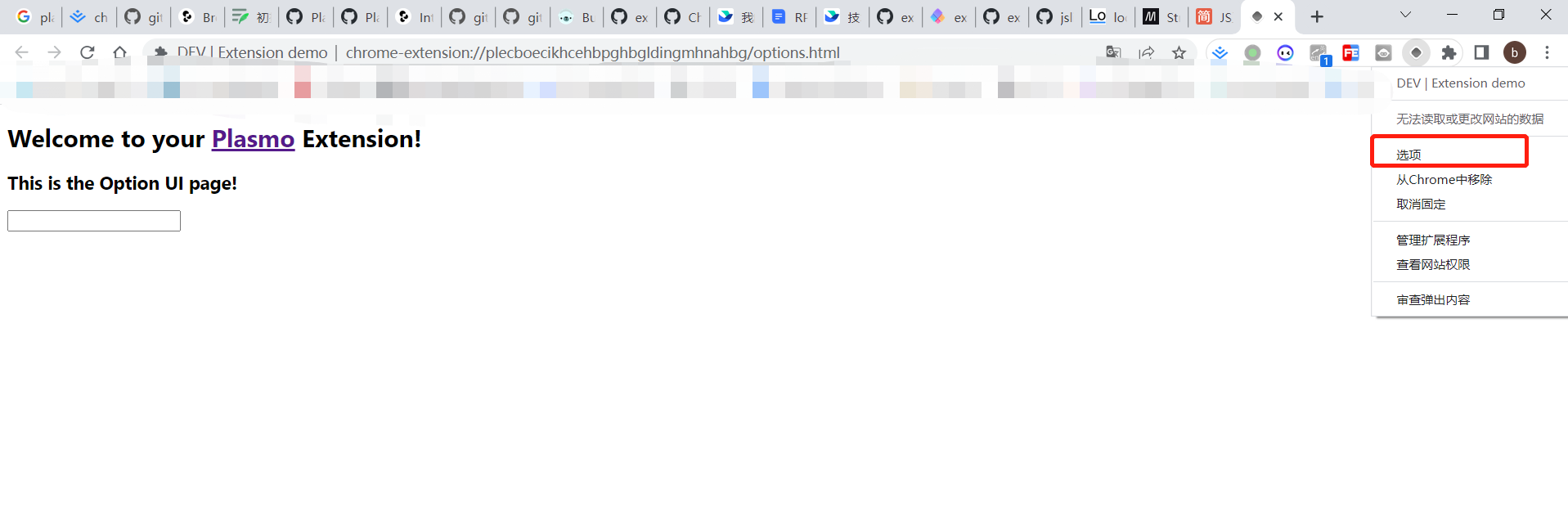 右键点击插件图标,选择【选项】栏后,会打开个新页面,这个页面一般用作插件的配置页面 | options.tsx 或 options/index.tsx |