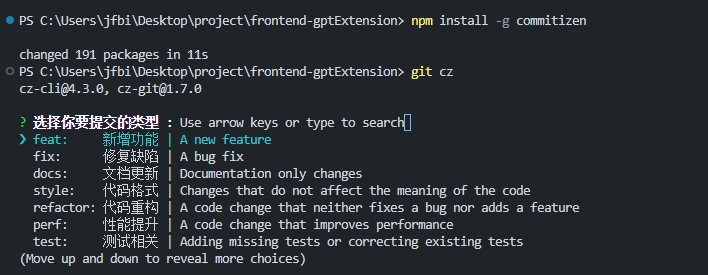 也可以全局安装 commitizen,之后使用 git cz 命令替换 git commit 命令: