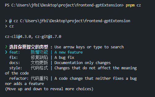 上面的配置都完成后,运行 pnpm cz,按照提示填写 commit 信息:
