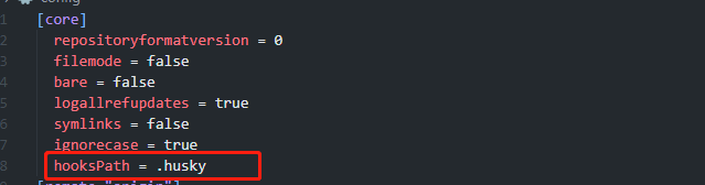 - 修改 .git/config 配置文件,core.hooksPath = .husky(指向 husky 新建的目录)