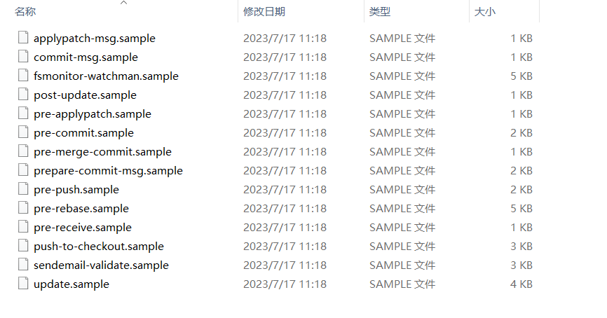 Git hook 都被存储在 Git 目录下的 hooks 子目录中。 也即绝大部分项目中的 .git/hooks 。 这些以 .sample 结尾的文件都是在 git init 初始化时,git 默认安装的示例文件,这些文件都是 shell 脚本,移除后缀就可以启动了。